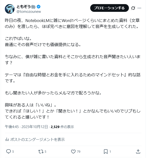 普通にその音声だけでも価値提供になる。ちなみに、僕が雑に書いた資料とそこから生成された音声聞きたい人います?…